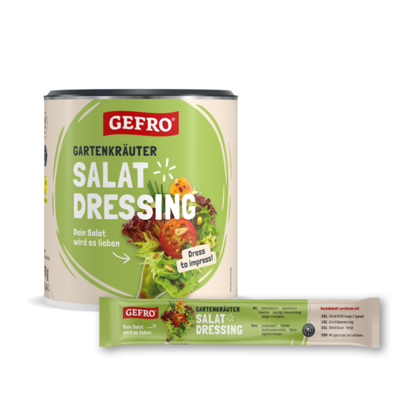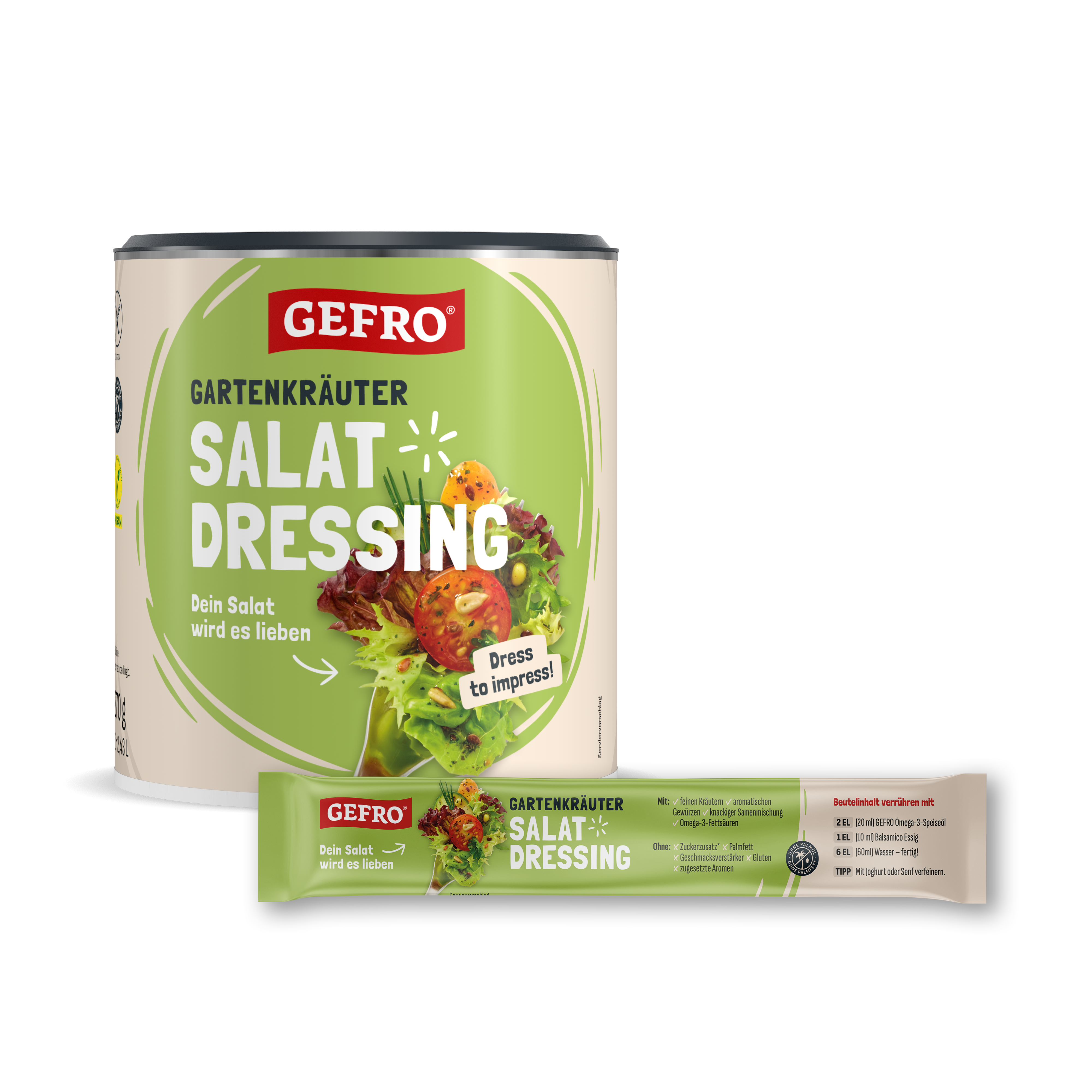 Sajauc 1 ēdamkaroti (apmēram 12 g) vai vienu porciju iepakojumu ar 2 ēdamkarotēm (apmēram 30 ml) GEFRO Omega-3 augu eļļas un 4 ēdamkarotes (apmēram 60 ml) ūdens un pārlej salātiem – gatavs!
